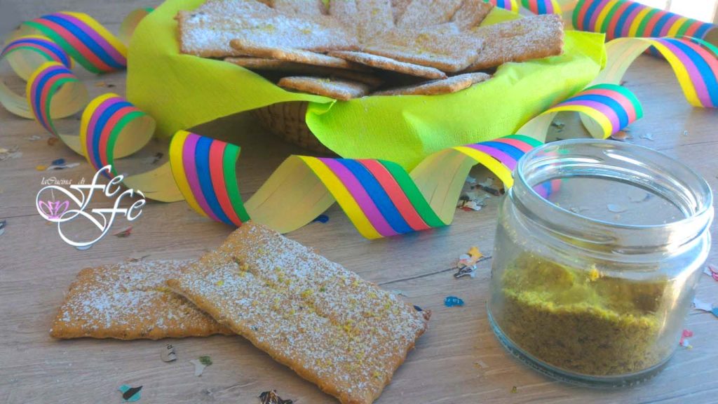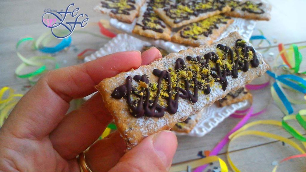 Vandaag is het Vette Donderdag en ik ben hier om een carnavalsrecept voor te stellen! De beroemde chiacchiere, of frappe, zoals ze vaak in andere delen van Italië worden genoemd! Het is een dessert dat strikt gefrituurd moet worden, en ver van mij om het tegendeel te beweren! Helaas heeft de dokter me de laatste tijd op dieet gezet en kan ik me zelfs op zeldzame gelegenheden als deze niet veroorloven om van de regels af te wijken! Natuurlijk moest ik toch op een bepaalde manier vieren, nietwaar? En hier is mijn versie uit de oven, veel lichter en met heel weinig boter, maar net zo heerlijk. Eerlijk gezegd herinner ik me dat ik ze ook in het verleden heb gemaakt, maar ik vond ze toen helemaal niet lekker, dus ik had het idee genegeerd door ze niet op de blog te plaatsen! Dit jaar heb ik er echter voor gekozen om ze te verrijken met de smaken van mijn land, door aan het deeg Bronte pistachemeel en Siciliaanse amandelen toe te voegen. Ik moet zeggen dat ze echt een traktatie waren. Ik zeg waren, want ze zijn al helemaal op! Weg met de lijn! Maar wat maakt het uit, ze waren licht! Dit recept deel ik graag, omdat ik niet denk dat ik de enige ben die zich geen frituur kan of wil veroorloven! En het is zeker een goed compromis gezien het eindresultaat! Inderdaad, ik zal je niet vertellen dat ze net zo goed zijn als gefrituurde, maar ik verzeker je dat hun krokante en knapperige textuur absoluut niet slecht is, ik zou zeggen, onverwacht boven verwachting! Toen heb ik ze, op advies van mijn nichtje, verrijkt met een pure chocoladeglazuur en extra pistachemeel, dat het gehemelte die extra heerlijke toets zal geven die vooral kinderen willen! Proberen om te geloven!