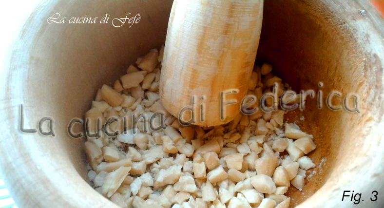 Hak apart in een houten vijzel de amandelen fijn met de stamper tot kruimels of hak ze sneller met behulp van een mixer (fig. 3).