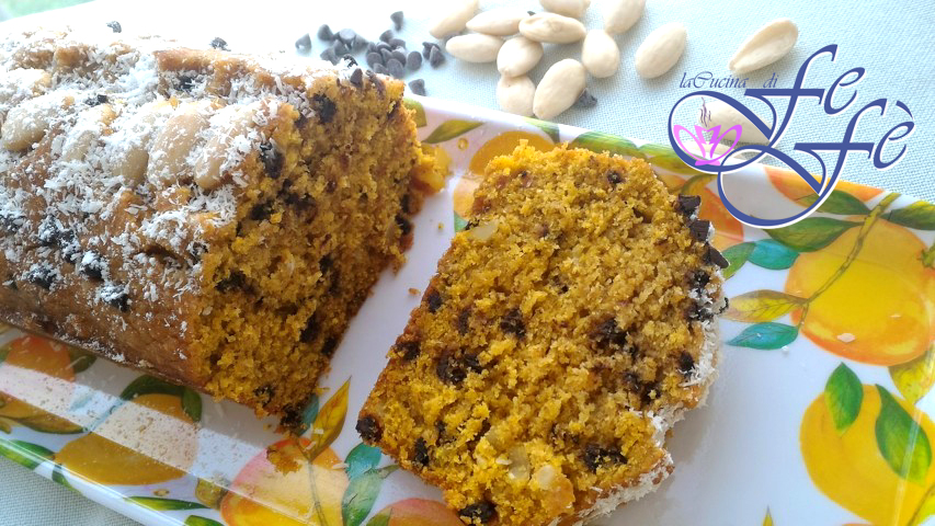 Ik moet bekennen dat de gele pompoen een van mijn favoriete herfstgroenten is, niet alleen omdat hij heerlijk is en rijk aan heilzame eigenschappen, maar vooral vanwege zijn veelzijdigheid! Hij leent zich namelijk uitstekend voor elke bereiding, zelfs voor desserts! Tussen de vele bereidingen van de afgelopen jaren, is er een waar ik erg aan gehecht ben, misschien omdat het mijn eerste experiment was met pompoen toen ik besloot een kookblog te beginnen! Na dit experiment volgden er nog vele andere, maar de cake die ik vandaag met jullie deel is echt speciaal en geschikt voor het hele gezin! Ik dank mijn zus dat ze me eraan herinnerde, aangezien het recept in de vergetelheid was geraakt van mijn allereerste blog, en de verschrikkelijke foto’s kunnen daarvan getuigen, maar het zou echt jammer zijn om het niet met jullie te delen! Het is een heerlijk zachte en zeer geurige cake, rijk aan smaak dankzij de amandelen en chocoladedruppels. Een echte lekkernij die iedereen zou bekoren. Perfect voor ontbijt en tussendoor met een kop warme chocolademelk of een warme en aromatische infusie. Ik heb het gisteren gepresenteerd op een prachtige dag in de buitenlucht met de familie, en ik moet zeggen dat het letterlijk uitverkocht was!