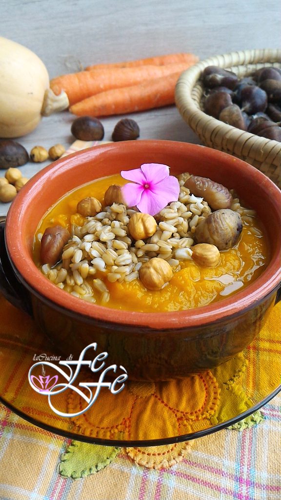 Zijn jullie het met me eens dat november, net als januari, twee maanden zouden moeten zijn die gewijd zijn aan gezonde gerechten voor en na de grote kerstfeesten? Na de zomer ben ik weer gezond gaan koken, wat me absoluut niet tegenstond, aangezien mijn lichaam de eerste tekenen van onbehagen begon te vertonen. Maar ik moet toegeven, en ik denk dat jullie dat al wel hebben begrepen, dat ik sowieso van deze authentieke, verwarmende en troostrijke gerechten houd! En dus zullen jullie een reeks moeten doorstaan van fit en detox recepten, die dan alleen maar gedeeltelijk fit zijn, als je alle gebruikte ingrediënten in aanmerking neemt. Bovendien, voor degenen die net als ik fan zijn van soepen, hoop ik dat ze een extra inspiratie zullen zijn om te variëren van de gebruikelijke saaie recepten van gekookte groenten. Dit gerecht dat ik jullie vandaag voorstel, was een ongelooflijk succes, niet alleen omdat het een volledig gerecht is vanuit voedingskundig oogpunt, maar ook omdat ik denk dat de zoete smaak van pompoen en wortelen goed samengaat met de volheid van volle haver en de uitgesproken rustieke smaak van geroosterde hazelnoten. En aangezien we in de herfst zijn, heb ik naast hazelnoten ook stukjes gestoomde kastanjes toegevoegd. Zoals velen van jullie weten, worden kastanjes van oudsher beschouwd als het “brood van de armen” en dat zegt veel over de macronutriënten die deze vruchten ons lichaam bieden. Natuurlijk, noten zijn erg calorierijk, maar ze compenseren dat perfect met al het andere! Dus een uitgebalanceerd, gezond en smakelijk gerecht dat je niet zal teleurstellen!