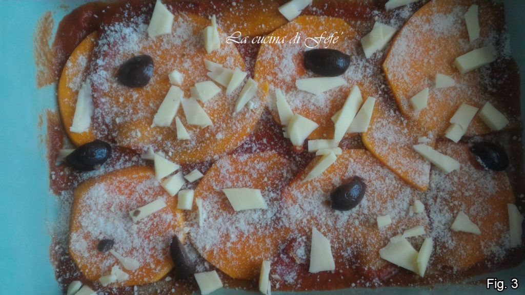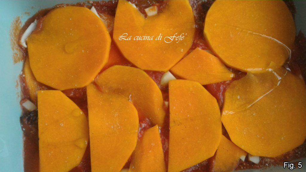 • Doe een paar eetlepels tomatenpassata op de bodem van een ovenschaal, verdeel gelijkmatig en maak de eerste laag pompoen (fig. 2).