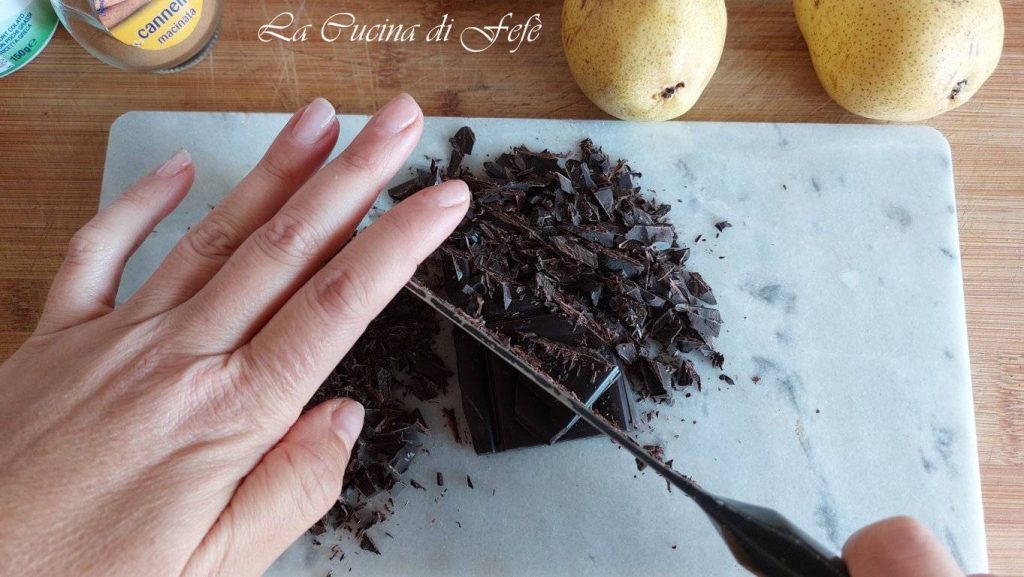 Ondertussen, bereid de verrijkende ingrediënten voor de porridgetaart: hak de pure chocolade grof met een mes op een snijplank.