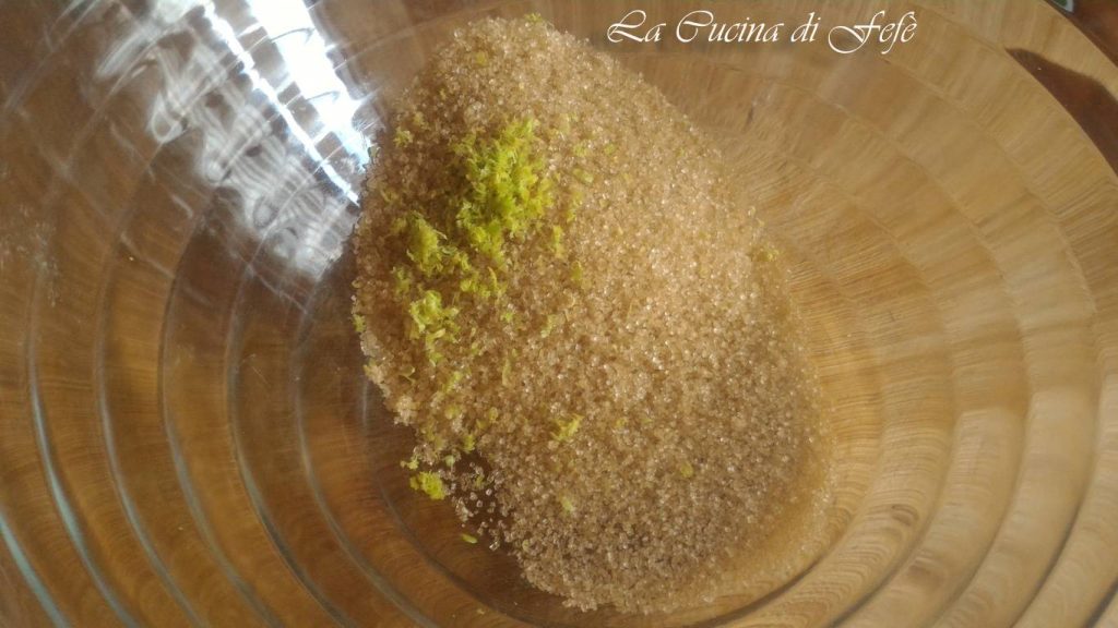 Voeg in een ruime kom de suiker toe aan de sinaasappelschil of citroen.