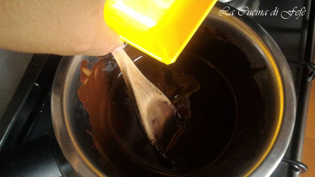 Voeg meteen de theelepel olie toe, zodat de chocolade glanzender wordt.