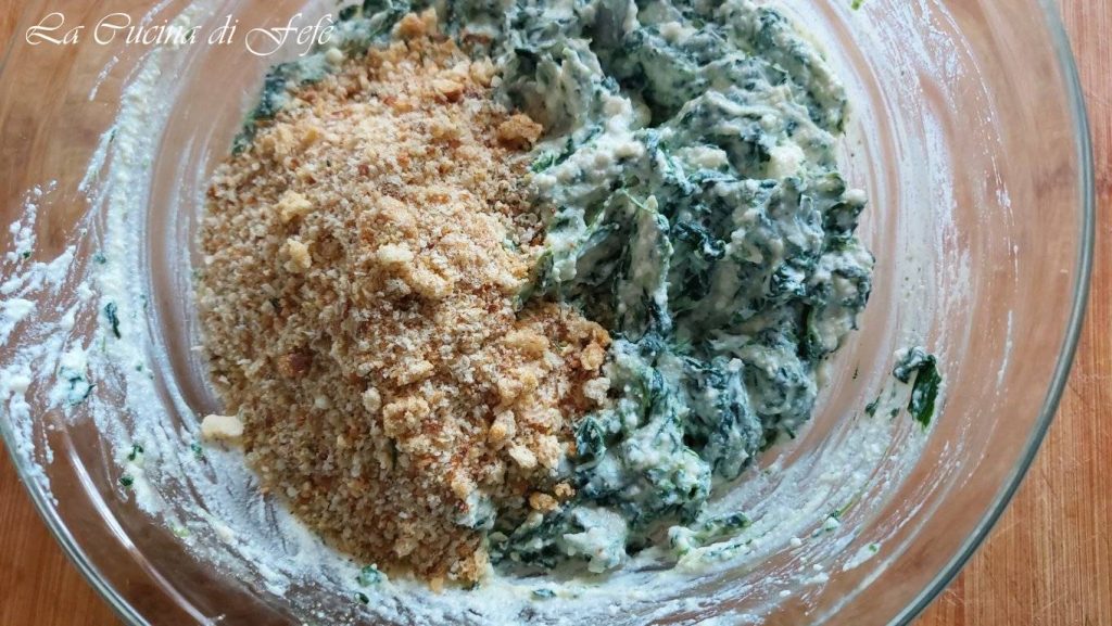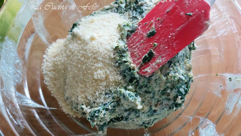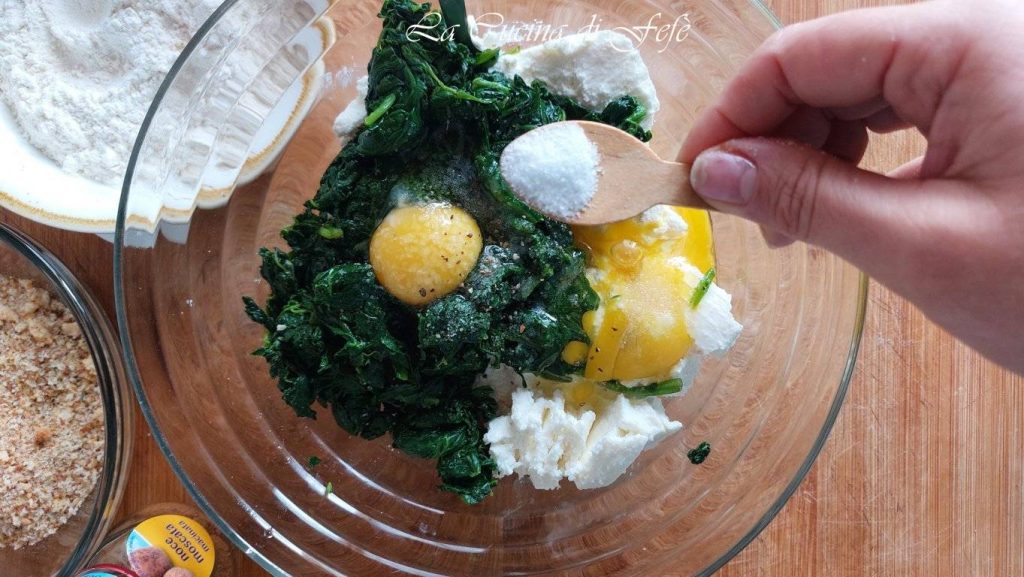 In een ruime kom, giet de ricotta die eerder van al het vocht is uitgelekt, voeg ook de spinazie, de eieren, twee snufjes zout en een snufje peper toe.