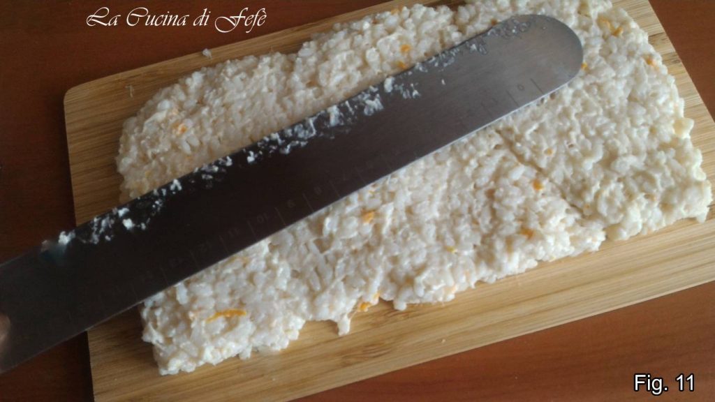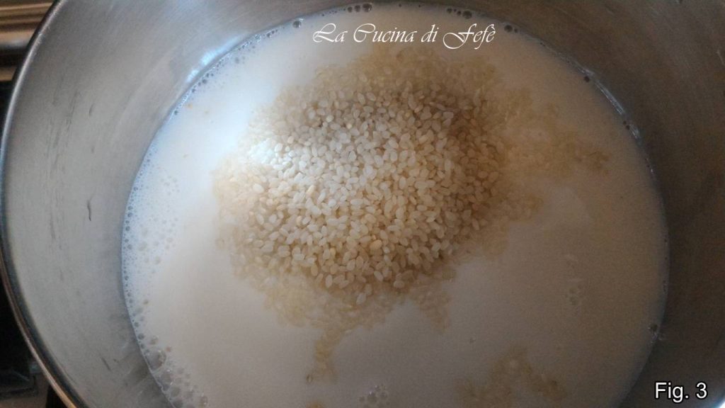 🔵* Belangrijk: laten dat de rijst de melk opneemt betekent niet dat je het in de pan laat aanbranden of uitdrogen; het moet vrij romig blijven, anders is het na afkoelen niet meer goed te bewerken en zal het moeilijk zijn om staafjes te vormen.