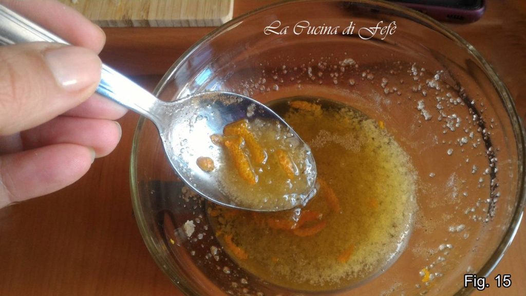 Als het lauw is, voeg je de suiker en de sinaasappelschillen toe en roer je goed door.