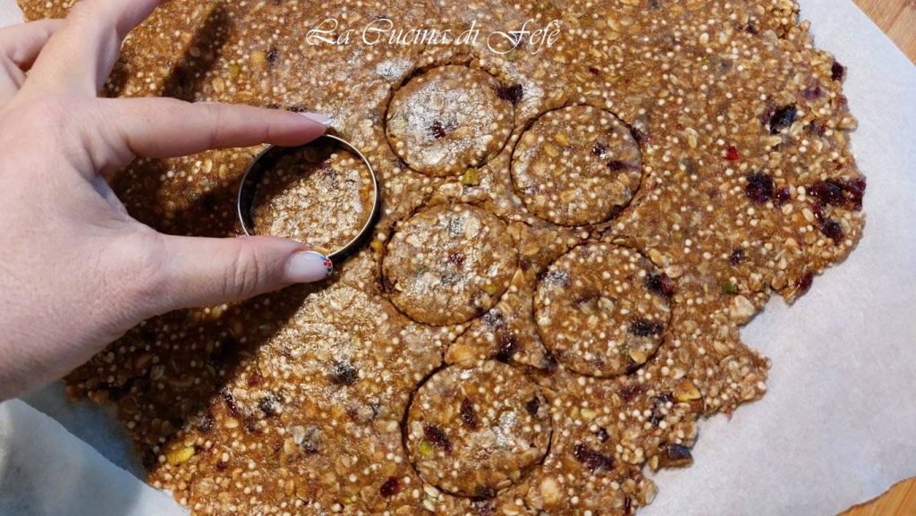 • Gebruik een ronde uitsteker van Ø 5 cm om de haverkoekjes met gepofte gierst uit te steken.