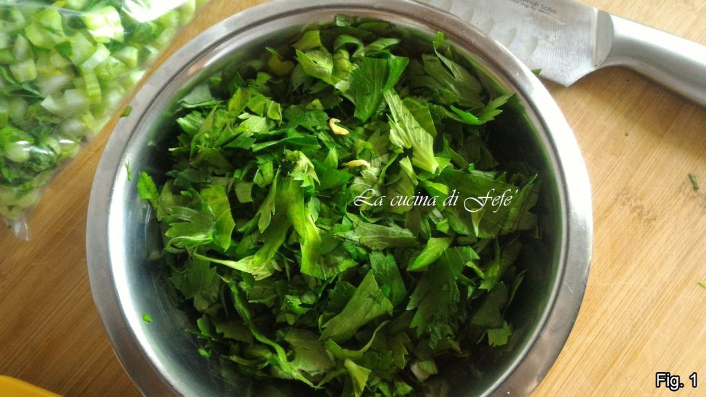 Was en maak de bleekselderij schoon, haal ongeveer 100 gram bladeren en stengels uit het hart en hak ze grof met een mes.