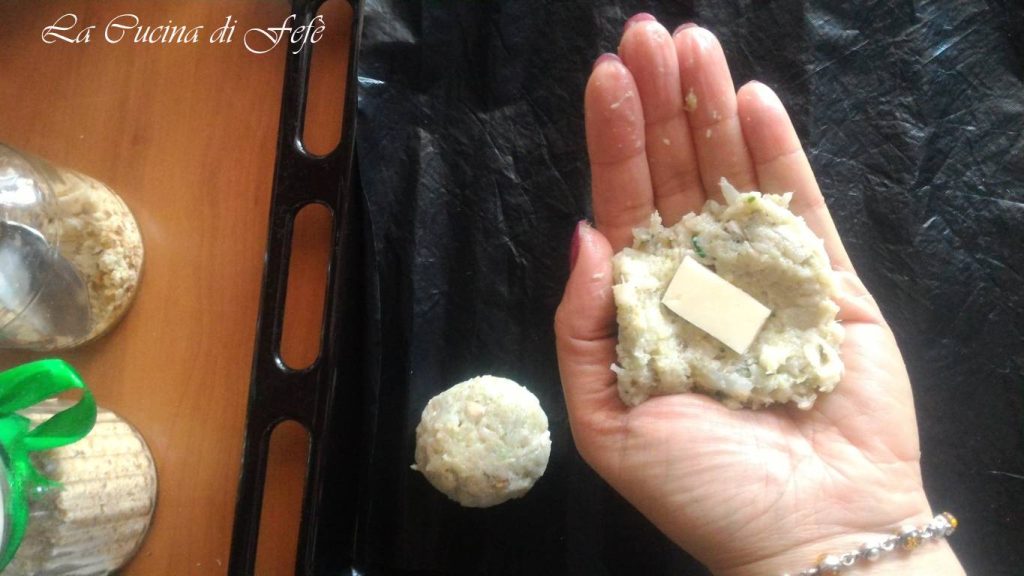 Vorm de balletjes op deze manier en plaats ze, voorzichtig indrukken met je handen, op een bakplaat bekleed met bakpapier of herbruikbaar teflonvel