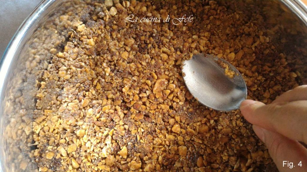 • Doe ze in een kom, voeg de gesmolten boter een paar seconden in de magnetron of au bain-marie en de chocolade topping toe en meng goed (fig. 3).