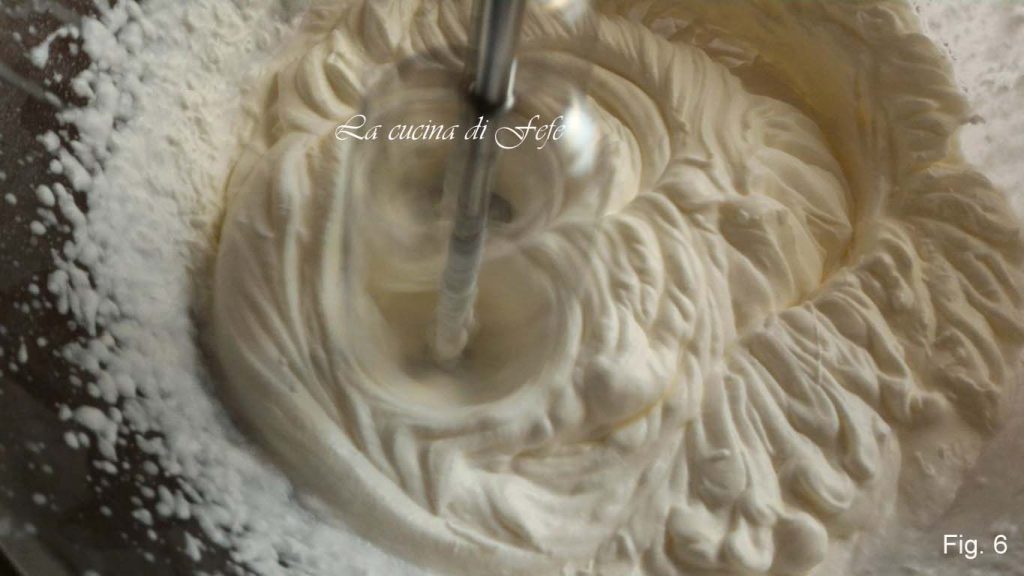 • Plaats in de koelkast om minstens 30′ te stijven. Ondertussen, in een andere kom, werk de ricotta goed uitgelekt de hele nacht door met een zeef met een lepel tot een crème, voeg dan de suiker toe (fig. 5).