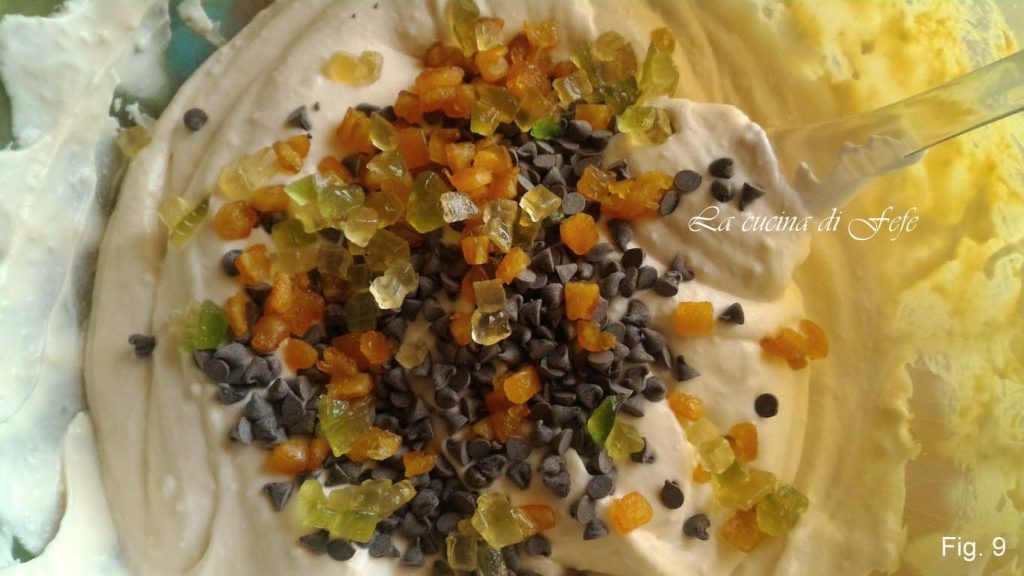 • Voeg de chocoladedruppels en gekonfijt fruit toe aan het mengsel (fig. 9).
