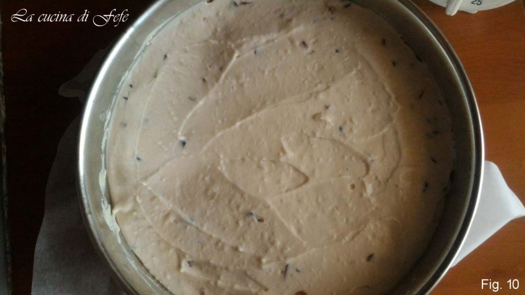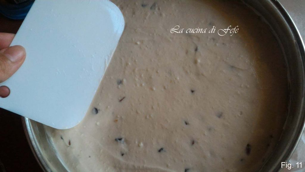 • Roer en giet de crème op de taartbodem die je uit de koelkast hebt gehaald (fig. 10).