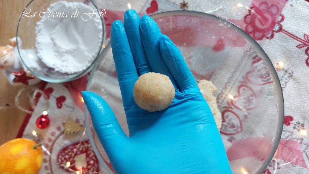 Leg de balletjes op een bakplaat bekleed met bakpapier of, zoals ik deed, met een herbruikbare siliconen bakmat en knijp ze met je duim en wijsvinger van beide handen, lichtjes drukkend. Zet de bakplaat in de koelkast en laat de koekjes minstens 3 uur rusten, maar het is beter een hele nacht***. Na de rusttijd, bak ze in een voorverwarmde heteluchtoven op 170°C gedurende 12′ niet langer. Ze moeten alleen een beetje goudbruin worden, anders worden ze te hard.