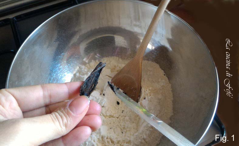 Zeef en meng de twee soorten bloem samen met het zetmeel en bakpoeder. Snijd het vanillestokje in met een mes en haal de zaadjes eruit met de punt (fig. 1).