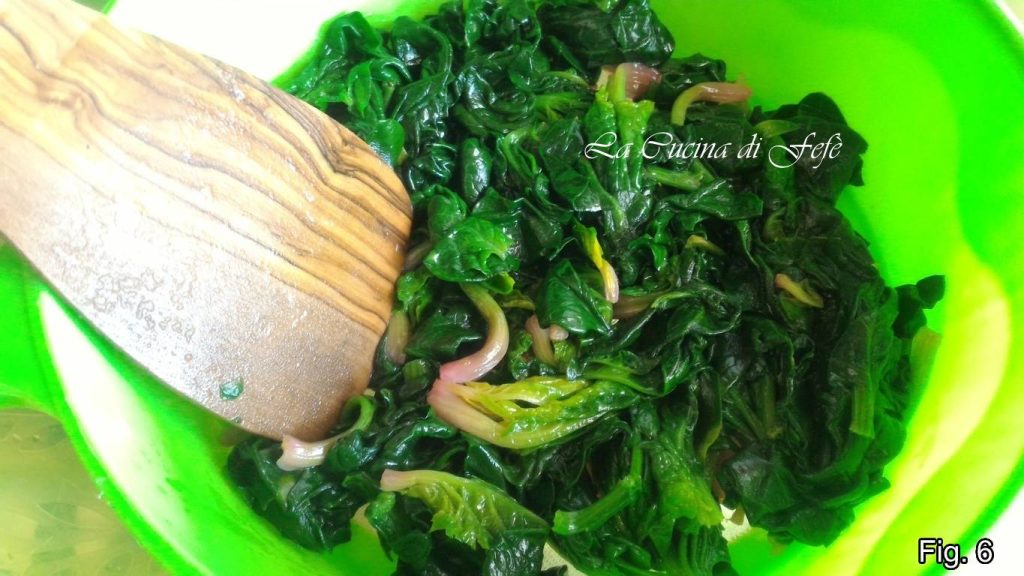 Laat de spinazie 5′ slinken, zet daarna uit, verwijder de knoflook en voeg zout naar smaak toe (fig. 5).