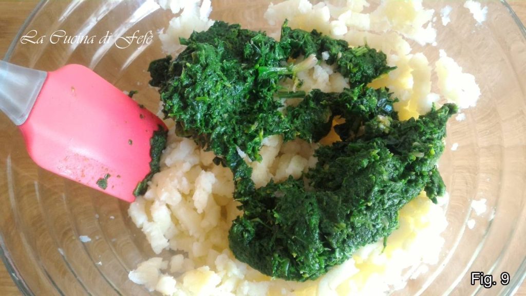 Voeg ook de goed uitgelekte spinazie toe en meng met een spatel (fig. 9).