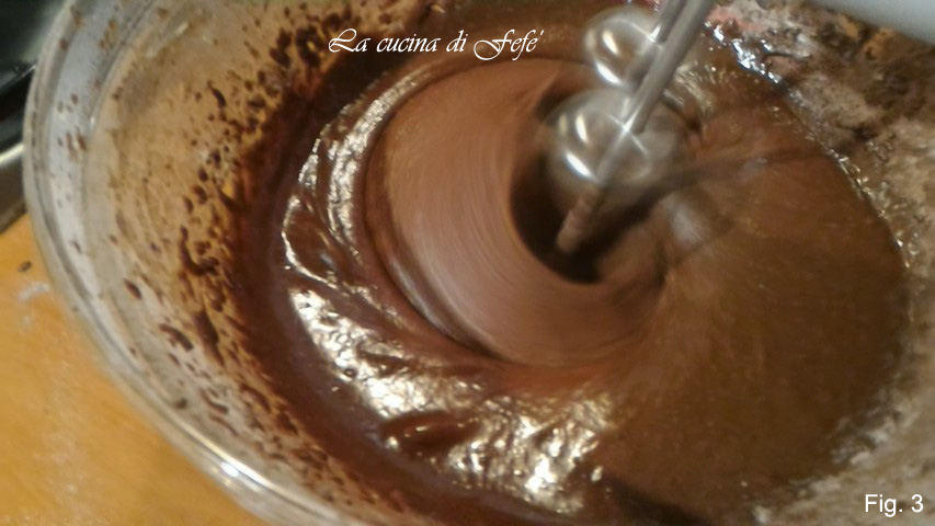 • Voeg de olie in een dunne straal toe terwijl je blijft kloppen met de kloppers, voeg dan beetje bij beetje de gezeefde meelsoorten met het bakpoeder en een snufje zout toe (fig. 2).