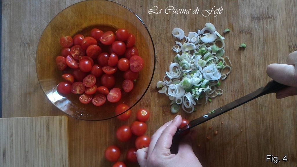 • Ondertussen, bereid de saus door het verse bosuitje, inclusief het groene deel, in dunne ringetjes te snijden en de cherrytomaten doormidden te snijden.