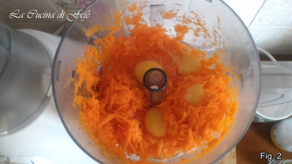 • Was en snijd eerst de wortelen, schil ze vervolgens met een dunschiller. Plaats ze in een keukenmachine en hak ze fijn (fig. 1).