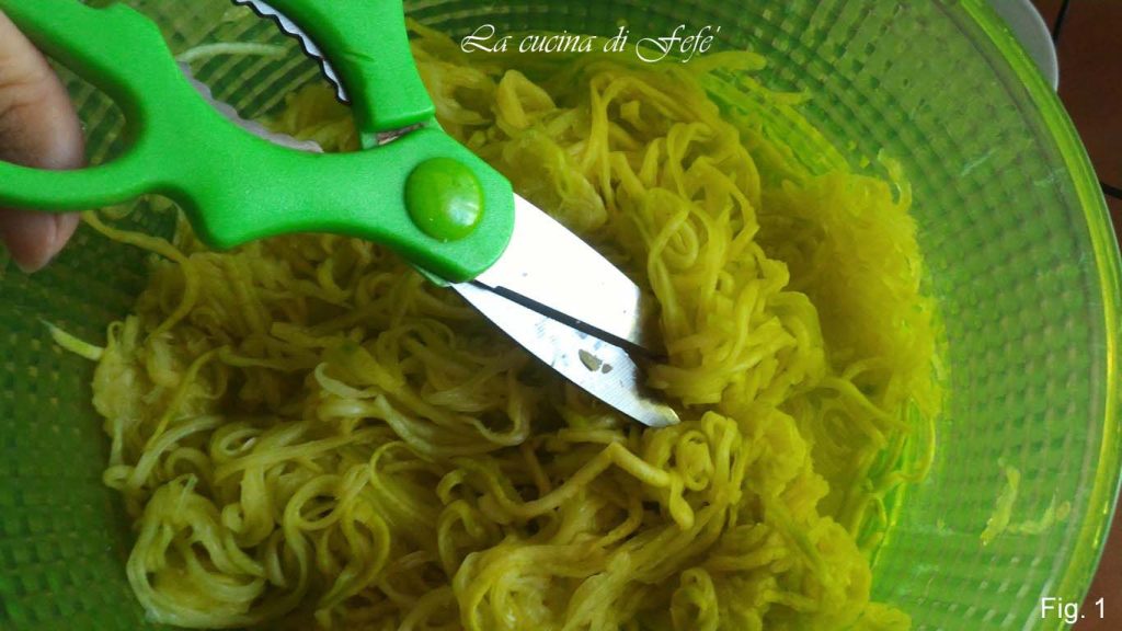 Was de courgettes, snijd ze af en snijd ze vervolgens met de spiraalsnijder in dunne spaghetti. Verkort ze met een keukenschaar. Rasp ze indien gewenst, zout ze en laat ze in een grote zeef 30 minuten rusten (fig. 1).