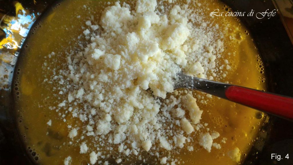 Voeg de geraspte pecorino toe en blijf mengen met een vork (fig. 4).