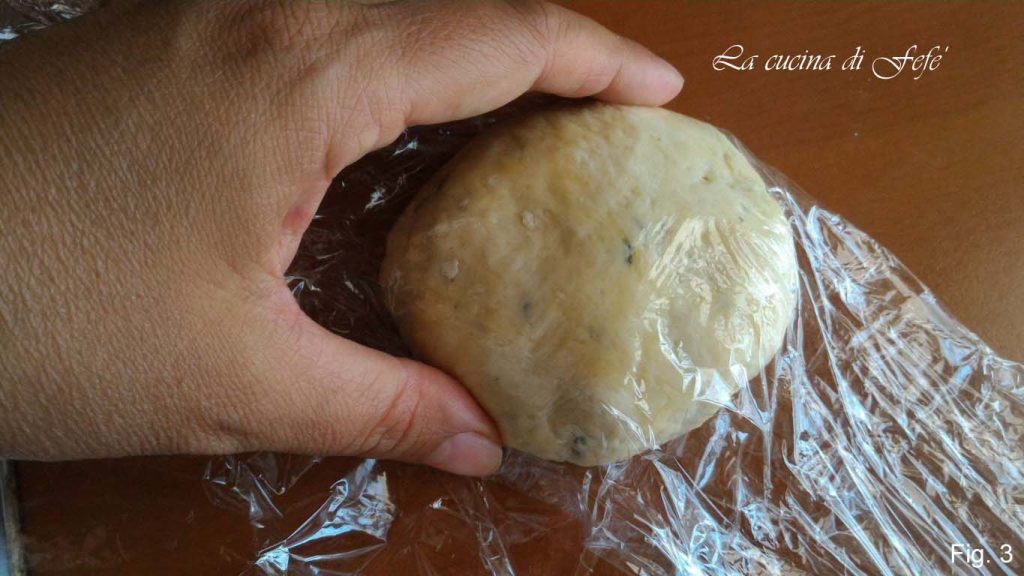 Breng alles over op een werkoppervlak zonder verder te bestuiven en werk het deeg tot een zachte, niet-plakkerige bal. Wikkel het in vershoudfolie en laat het 1 uur in de koelkast rusten (fig. 3).