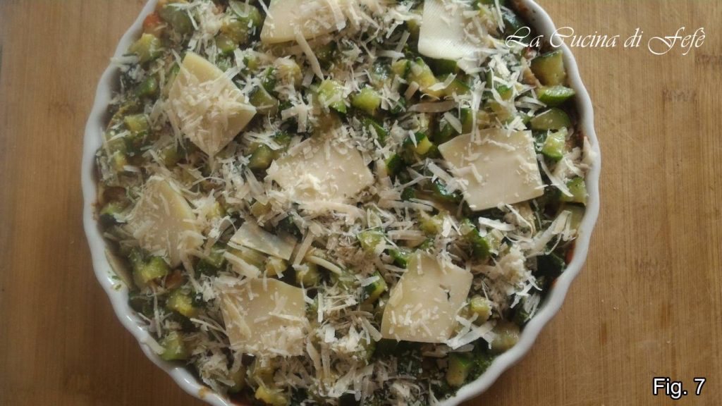 • Was intussen de courgettes, snijd ze in vrij kleine blokjes. In een koekenpan, bak een teentje knoflook in 2 eetlepels olie, voeg dan de courgetteblokjes toe en laat ze zachtjes stoven gedekt voor ca. 12′-13′, voeg alleen water toe indien nodig. Zet het vuur uit, zout en peper naar smaak. Laat afkoelen en verdeel de gekookte blokjes over de gehele ovenschaal (fig. 6).