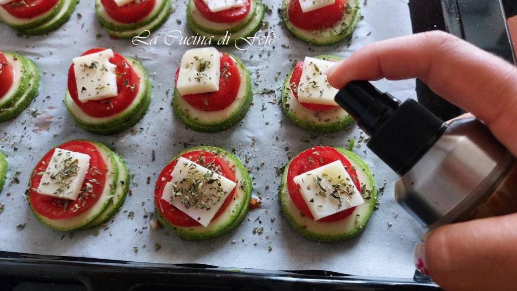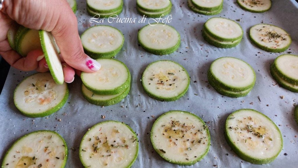 Leg de grotere plakjes courgette aan de basis van je torentjes op een bakplaat bekleed met bakpapier, en zout, breng op smaak met naar smaak oregano, een paar sprays olie en een draai peper (fig. 3).