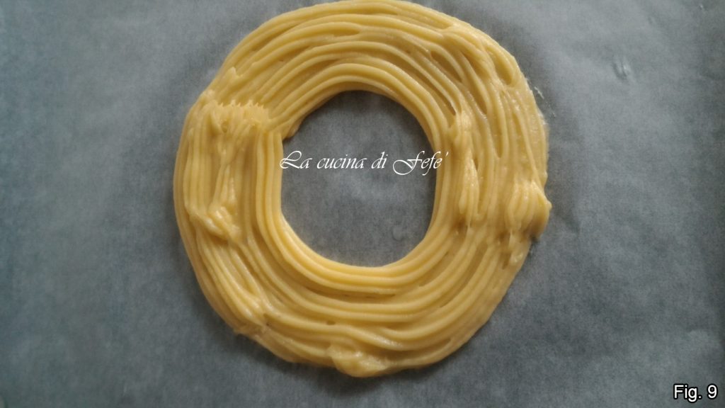 Om de zeppolone te maken, help jezelf met de verhoudingen door op een stuk bakpapier een cirkel met een diameter van maximaal 18 cm te tekenen, gebruikmakend van een vorm van die afmetingen*. Teken nu binnenin de cirkel een kleinere cirkel met behulp van een glas met een diameter van ongeveer 8 cm.
