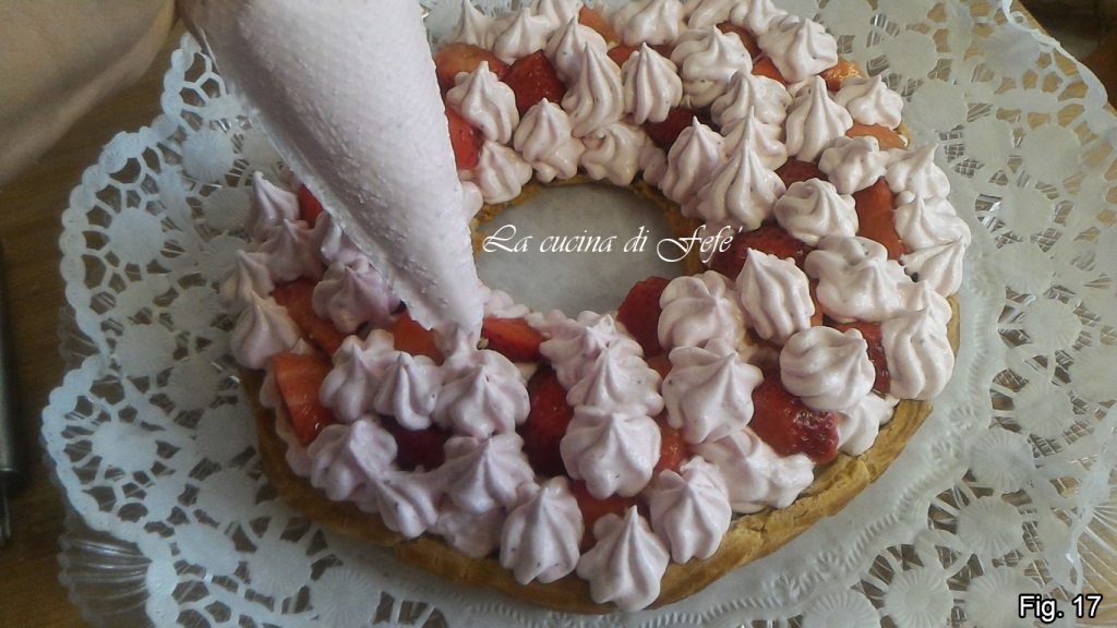 Voeg de andere helft van de zeppolone toe op de net gemaakte vulling en garneer naar wens met meer mascarpone- en aardbeiencrème zoals voor de paris brest.