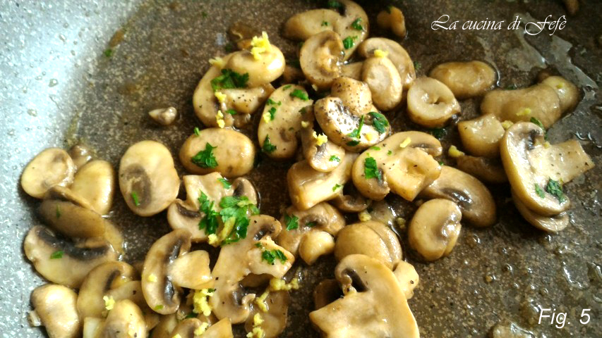 Reinig de champignons met een schone en goed vochtige doek, verwijder het deel van de stengel dat in contact staat met de aarde en snijd ze in plakjes. Verhit in een antiaanbakpan de knoflook met een scheutje olie en twee eetlepels kookwater gedurende 1 minuut. Voeg de champignons toe en laat ze verwelken met nog een schepje water (fig. 3).