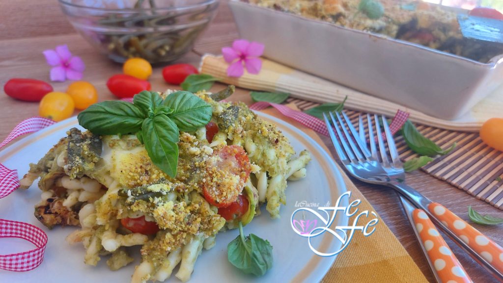 Deze zomer had ik het geluk een groente- en fruithandelaar te vinden die op zijn toonbank een uitstekende variëteit aan bonen aanbood, uiteraard lokaal geteeld. Ik haastte me dan ook om een voorraad aan te leggen en zo de immense schaarste van vorig jaar in te halen! Ik had er zo’n verlangen naar dat ik ervoor koos om ze gedurende hun hele seizoen eenvoudig te consumeren, dat wil zeggen zonder dit of dat nieuwe recept uit te proberen, het leek me zelfs een verspilling! Pas nu, nu we aan het laatste redmiddel zijn, heb ik besloten om in stijl af te sluiten door deze trofie uit de oven te bereiden met een pesto waarin bonen de hoofdrol spelen en waarvan ik het recept al eerder heb gedeeld! Bonen zijn een waardevolle bron van zowel vitamines als mineralen. Het is echter goed om te weten dat hun gunstige eigenschappen vooral samenhangen met de antioxidanten waarvan ze erg rijk zijn, die ons lichaam helpen beschermen tegen de werking van vrije radicalen, en dus tegen vroegtijdige veroudering en ontstekingen. Om ervoor te zorgen dat deze waardevolle voedingsstoffen aan tafel worden opgenomen, is de aanbeveling om verse bonen te stomen zodat ze ze niet verliezen in het kookwater en ze zo ongewijzigd mogelijk behouden. Na deze gebruikelijke en noodzakelijke inleiding raad ik u aan om dit vegetarische hoofdgerecht te proberen, niet alleen omdat het echt gezond en energiek is, maar ook omdat het een geweldige manier zal zijn om uw kinderen groenten te laten eten, die deels gepureerd zullen worden in plaats van de klassieke bechamelsaus! De heerlijkheid van dit gerecht komt voort uit de interne laag, rijk aan groenten zoals cherrytomaatjes, gegrilde courgette en de bonen zelf, op smaak gebracht met plakjes gesmolten Sila DOP kaas uit Calabrië. Uiteindelijk, een dubbele pesto van bonen rijk aan geroosterde hazelnoten en een paar eetlepels pistachepesto! Het geheel bestrooid met een flinke handvol zelfgemaakt paneermeel en pistachemeel alsof er geen morgen is! Een perfect gerecht voor uw speciale lunches, om in eenvoud te verrassen en uw gasten een waardig alternatief voor de gebruikelijke ovenschotel te bieden om je vingers bij af te likken!