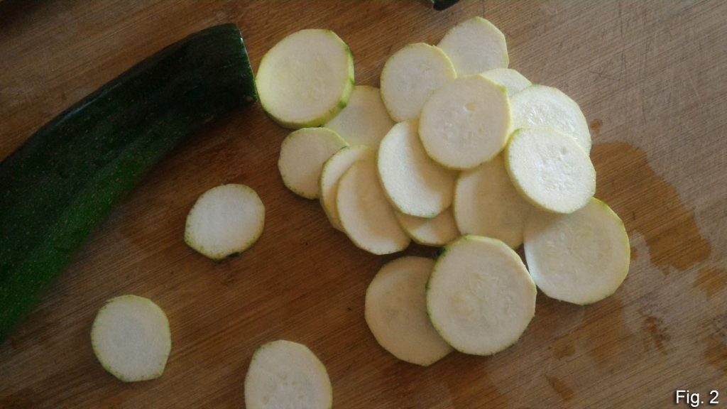 Was, snijd de uiteinden van de courgette af en snijd deze in niet te dunne schijfjes (fig. 2). Gril ze vervolgens 2′-3′ per kant op een goed hete grillplaat, op laag vuur, en bestrooi ze licht met zout (fig. 3).