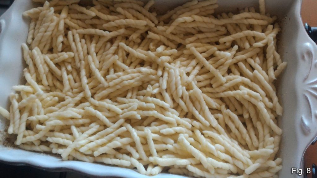 Doe de helft van de trofie in een ruime ovenschaal die eerder is ingevet en bestrooid met paneermeel (fig. 8).