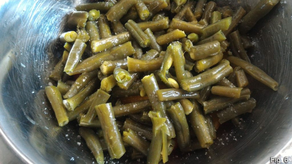 Snijd de bonen die eerder gestoomd zijn, in stukjes met behulp van een schaar, bestrooi ze vervolgens licht met zout, besprenkel ze met nog een scheutje olie en meng (fig. 6).