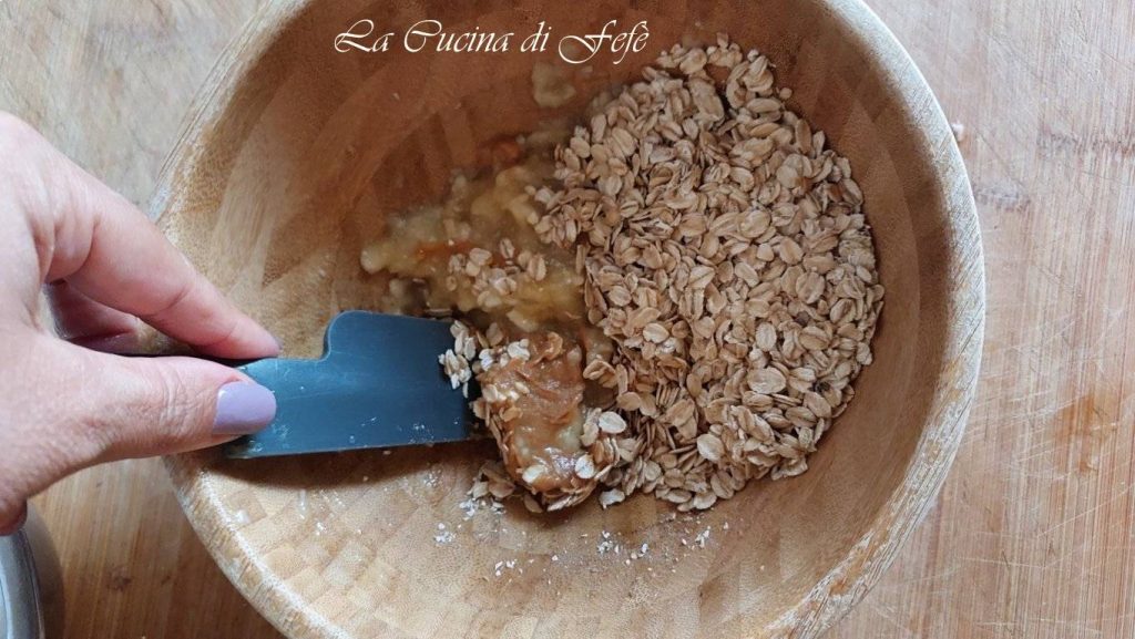 • Voeg ook de havervlokken toe en voeg de pindakaas toe, in deze fase raad ik ook aan om de pure chocoladedruppels toe te voegen en meng met een spatel.