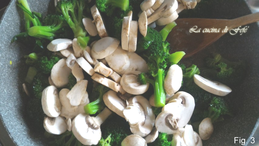 • Laat 5′ intrekken, voeg dan de schoongemaakte en in plakjes gesneden champignonpaddenstoelen toe. Dek af met een deksel en kook 15′ onder toevoeging van meer bouillon indien nodig. Breng op smaak met zout (fig. 3).
