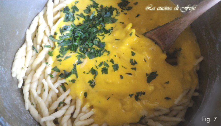 • Verwarm licht gezouten water voor de trofie en kook ze al dente. Laat ze uitlekken met een schuimspaan en breng ze op smaak met de kurkumabechamel en de fijngehakte peterselie (fig. 7).