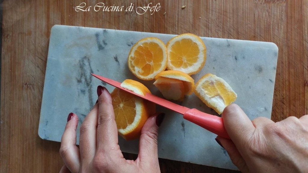 Begin ondertussen met de sinaasappels: was ze en fileer ze, leg ze op de snijplank en verwijder beide uiteinden, schil zowel de schil als het witte deel (albedo) met een diepe snede die moet worden gemaakt volgens de natuurlijke ronde vorm van de sinaasappel.