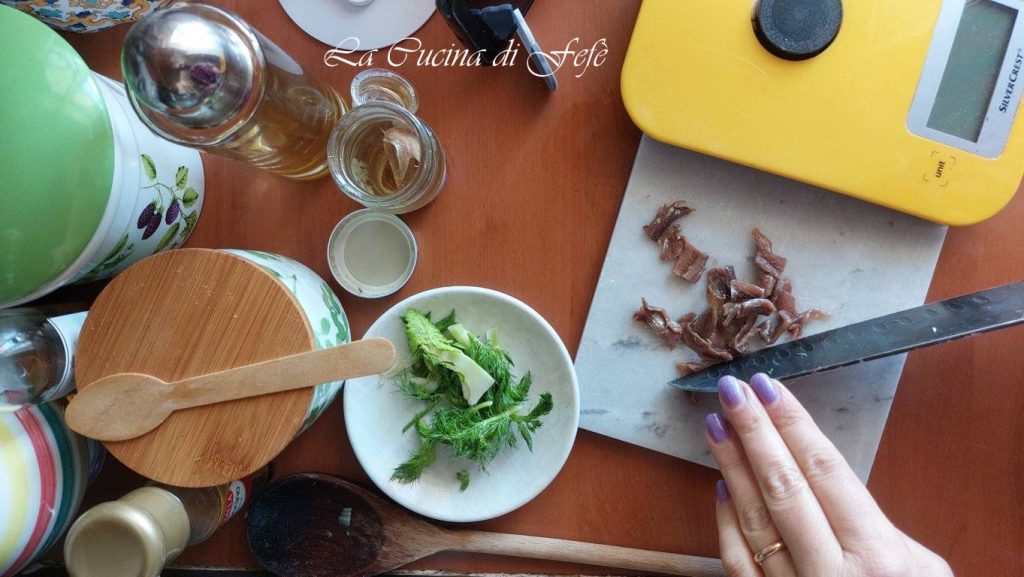 • Ondertussen, haal de venkelgroen en hak deze grof met het mes en doe hetzelfde met de ansjovis in olie.