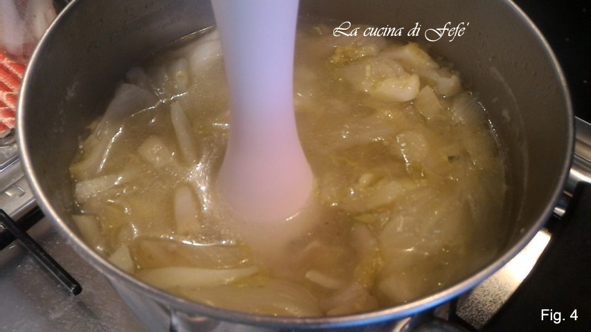 Kook vanaf de kooktijd ongeveer 25′, voeg alleen indien nodig extra bouillon toe en een rasp gember. De venkel moet erg zacht worden. Zet uit, breng op smaak met zout, verwijder de overtollige bouillon zonder deze weg te gooien, laat dan afkoelen en pureer met de staafmixer (fig. 4).