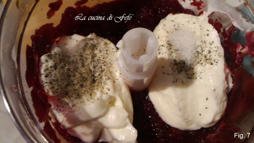 Kook in gezouten water gedurende 30′, laat uitlekken en pureer met twee eetlepels kookvocht. Voeg dan ook de yoghurt toe, zout en peper (fig. 7).