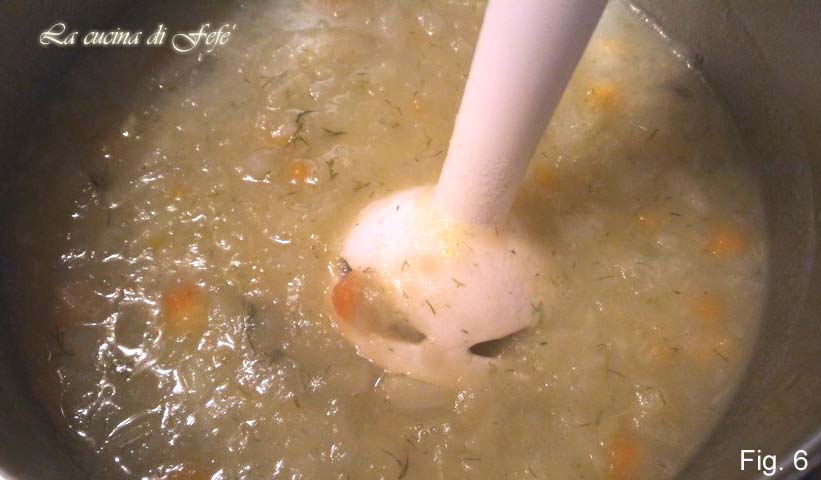 Blijf nog 2-3 minuten bakken, af en toe roeren en nog eens 2 eetlepels warme bouillon toevoegen. Bedek de groenten volledig met de bouillon, voeg zout toe en laat met deksel, op laag vuur ongeveer 20 minuten koken, of totdat alle groenten zacht zijn geworden (fig. 4).