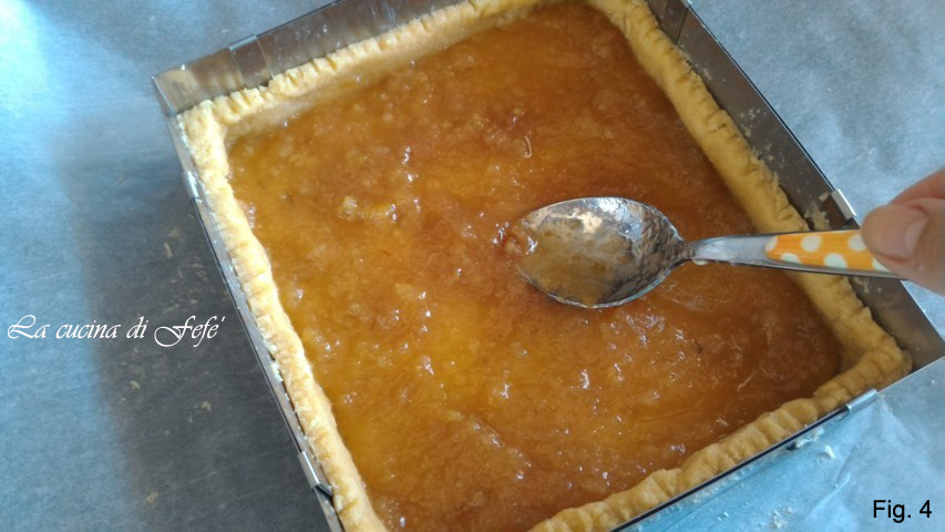 Vul je taart met een eerste laag perenjam en zet hem in een voorverwarmde statische oven op 180°C voor 45′ (fig. 4).