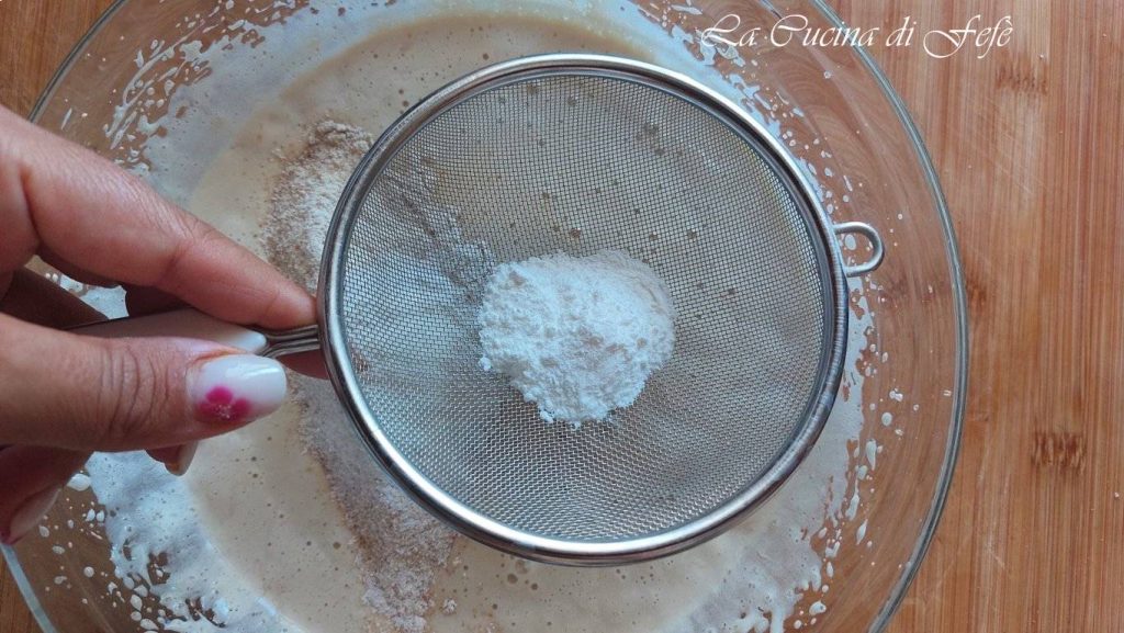 Voeg beetje bij beetje ook de vooraf gezeefde droge ingrediënten toe, namelijk de volkoren bloem en het bakpoeder, terwijl je blijft kloppen met de kloppers.