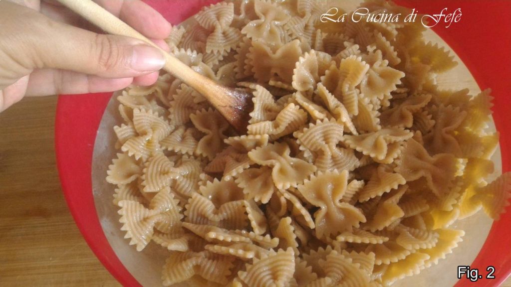 Voeg de farfalle toe aan alle andere ingrediënten (fig. 8), voeg ook de verkregen emulsie toe en meng goed (fig. 9).