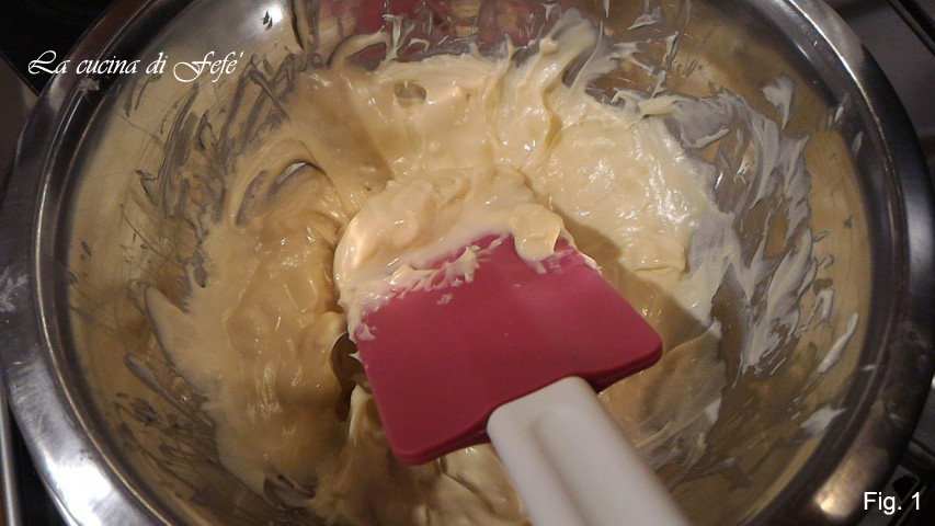 Allereerst week je de gelatineblaadjes in koud water gedurende 5′-10′ totdat ze zacht zijn geworden. Hak ondertussen de chocolade met een mes en smelt het au bain-marie of in de magnetron in een grote kom (fig. 1).