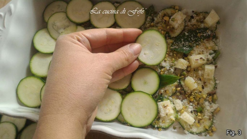 Giet in een anti-aanbaklaag ovenschaal twee eetlepels water en twee eetlepels olie en begin met het samenstellen van de eerste laag courgettes. Besprenkel met een andere scheut olie, voeg provolone in blokjes toe, een paar eetlepels geraspte Parmezaanse kaas, enkele blaadjes munt, 1 flinke eetlepel paneermeel en 1 van eerder grof gehakte pistachenoten. Breng op smaak met zout en peper (fig. 2).